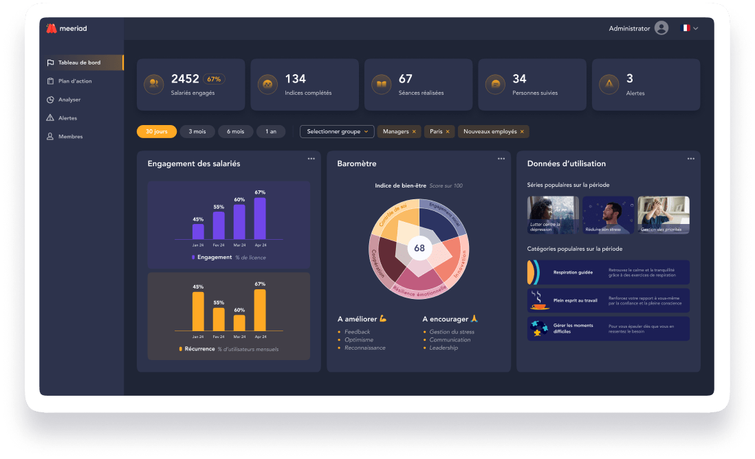 Mesurez le niveau d'engagement de vos collaborateurs, repérez les signaux faibles et engagez vos Managers dans l'amélioration de l'expérience des collaborateurs. Meeriad offre une solution facile à utiliser et personnalisable pour évaluer, comprendre et gérer l'engagement de vos équipes.